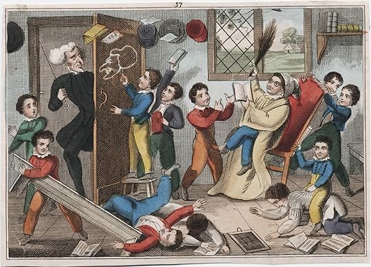 I’m not sure exactly what kind of school is depicted in the next image, a cartoon by an unknown artist – possibly a grammar school as it looks well equipped (note the tomes in the top right and the exercise books on the floor) and the master and pupils do not look particularly underfed or impoverished. The boys start a riot the minute the master is out of the room. Then he’s back, cane at the ready. One boy is apeing him by wearing his glasses and brandishing a switch, another chalks a cruel caricature. Through the window, lies nature and freedom, a contrast with the confines of the classroom. Eton famously erupted into riot in 1818.