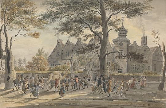 James Miller’s 1780 watercolour of Dr Fountain’s Boarding School in Marylebone’s Old Manor House (it stood opposite the Old Church, which is still there), appears to show a real event. The commotion caused by the arrival of a camel, perhaps in the possession of a travelling circus, outside the school gate. The boys coming running out to take a look, as other members of the community also congregate including two beautifully drawn ragged girls. Boarding schools were for-profit businesses (as the Yorkshire schools scandal showed so clearly). They were set up and failed regularly, much like restaurants do in our economy.