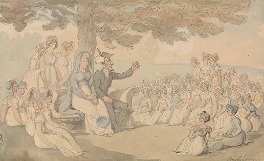Thomas Rowlandson’s watercolour sketch of Dr. Syntax lecturing the pupils of a boarding school for young ladies, overseen by a demure mistress, portrays an ideal of compliant female innocence. They sit in rapt attention, hanging on ‘the wisdom of his [Dr. Syntax’s] tongue.’ Rowlandson’s illustrations accompany a text by William Coombe 2 in which he describes the girls: