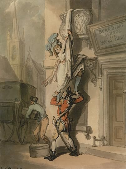 Thomas Rowlandson was rather more concerned with the ‘op’ning leaves’ in his earlier print of a nubile (and probably naive) young woman eloping from a boarding school to join her soldier lover, who upskirts her leeringly while she stands on his shoulders. A servant loads her trunk into the coach, symbolising the transfer of all her worldly, not to mention her bodily, goods to her husband.