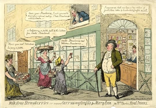 Attributed to Isaac & George Cruikshank, Folkstone Strawberries or more carraway comfits for Mary Ann, 1810, shows the front of S.W. Fores’ shop at the corner of Sackville Street and Piccadilly. Note that the majority of the items shown in the window are books rather than prints. Credit: The Print Shop Window