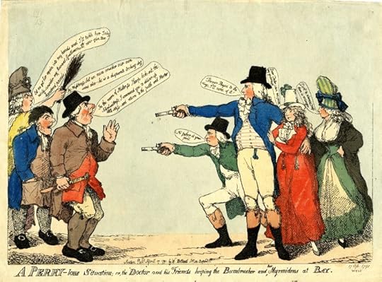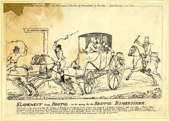 Although Gillray’s prints were pricey, neither he nor Humphrey made a fortune. There was simply not much money in the sector. To boost income print sellers occasionally put on exhibitions and charged the public for entrance. Sometimes a particular print would attract a crowd, which was good for business. This was the case with Elopement from Bristol– or too many for the Bristol bumbrusher and A Perry-lous situation; or, the doctor and his friends keeping the bumbrusher and her myrmidons at bay satirising the tragic case of the abduction and forced marriage of a 14-year-old heiress Clementina Clerke by Richard Vining Perry in 1791 and the frenzied efforts of Clerke’s former schoolteachers to bring Perry to justice for doing so. 2