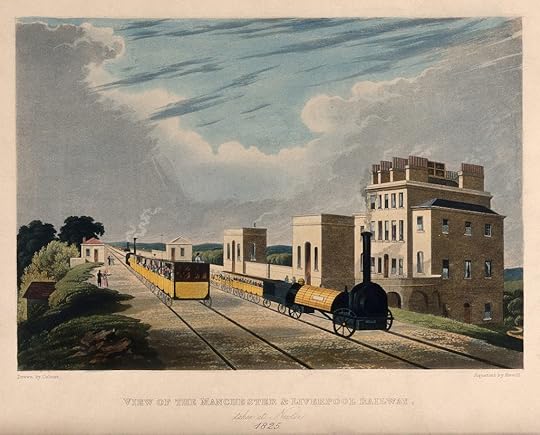 ‘A steam train on a line at a station with passengers travelling. Coloured aquatint by Havell after Calvert.’ Credit: Wellcome Collection. CC BY