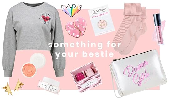 *WILD HEARTS CLUB SWEATER | *‘BABE’ STICKER | *BFF COOKIE | *‘GIRL GANG’ PIN | *SNUGGLY CASHMERE SOCKS | *COVER FX SHIMMER VEIL ‘BLUSH CHAMPAGNE’ | *‘DAMN GIRL’ MAKEUP BAG | *LANCÔME MACAROON CREAM BLUSH & BLENDER DUO | *HERBIVORE ROSEWATER CREAM | *DIOR APRICOT NAIL CREAM | *CUTE GOLD STUDS