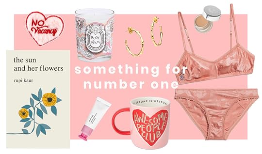 *‘NO VACANCY’ FLUFFY HEART STICKER | *DIPTYQUE ‘ROSE DELIGHT’ CANDLE | *GORGEOUS MOLTEN GOLD HOOPS | *GLOSSIER STRETCH CONCEALER | *STUNNING SATIN BRA | *MATCHING SATIN BRIEFS | *‘AWESOME PEOPLE CLUB’ MUG | *GLOSSIER CLOUD PAINT CREAM BLUSH ‘PUFF’ | *RUPI KAUR ‘THE SUN & HER FLOWERS