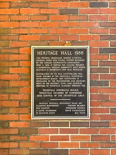 A plaque on the exterior of the Heritage Hall building (photo by Amy Peterson O’Brien)Heritage Hall was originally a retail general store and filling station managed by the Cahaba Cooperative Association. Built in 1938 along with the homes in the Cahaba Project, the store served the needs of the Cahaba Project residents.