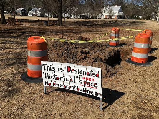 As I made my way up North Mt. Pleasant Avenue toward where my truck was parked on Pineville Road, because I had three more hours to drive without stopping at Priester’s Pecans this time, some orange and red banners caught my eye. I guess they hadn’t stood when I had first arrived, when that courthouse was my sole focus. I approached an orange one, several feet above my head, and squinted in the morning sun.