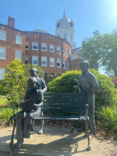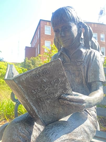 The sculpture of three Depression-era children reading To Kill a Mockingbird (photo by Gary Lloyd)I recently drove back to Trussville from Gulf Shores and made a 9 a.m. stop in Monroeville, not for a McDonald’s or a bathroom, but for a memory. I had always wanted to see the small town that produced author Harper Lee and her masterpiece, To Kill a Mockingbird, and to a smaller though not insignificant degree fellow author Truman Capote. I planned to see a couple historic markers and the Old Courthouse Museum’s exterior, perhaps a 20-minute detour.
