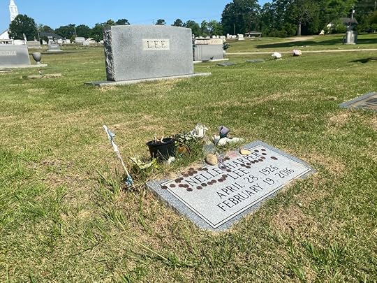 Monroeville was near impossible to leave. I parked at a bank and walked to the former home location of Capote’s family, where he spent summer vacations. I pulled in at the Monroe County Public Library and read a historic marker about Lucas’ Raiders dashing through Monroeville during the Civil War. I drove a half mile to Pineville Cemetery, where I encountered a Greyhound full of tourists visiting Lee’s modest gravesite. Her full name, Nelle Harper Lee, was encircled by 39 pennies, one seashell, numerous rocks, a pair of Mardi Gras beads, a couple potted plants, white flowers, and a ceramic dinner plate.