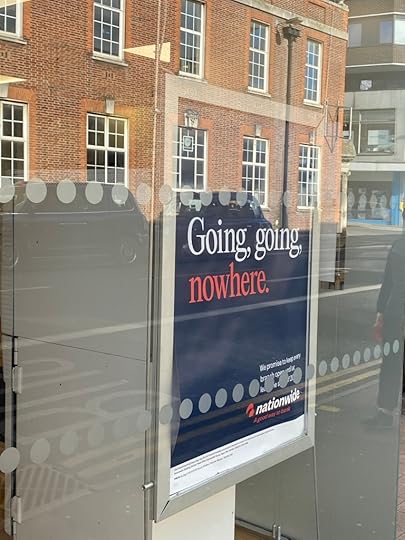 Towards the end of my ride, I passed a branch of Nationwide Building Society. In the window there was an enigmatic poster displaying three words: ‘Going, going, nowhere’, I think referencing the fact that the branch would not be closing any time soon, unlike other establishments on the rapidly changing modern high street.