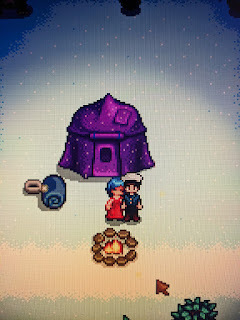 In Stardew Valley, Emily and I aren't married yet. There's been no rain for me to go get the necklace from the old guy on the beach. We did go camping though.