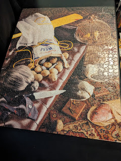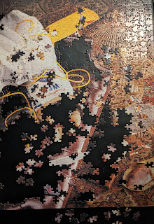 I began putting together a puzzle. Back when I visited Kingston with friends for a Spooky Vacay, we stopped by a store and I bought a jigsaw puzzle. But it's not just a puzzle. There is a mystery involved in it. This particular one is the Alfred Hitchcock mystery puzzle. The puzzle inside doesn't match the box and, once it is complete, there is a mystery to solve. I've been wanting to try these puzzles as jigsaws are too easy for me. Even the all black one I finished in about a week. The Wave puzzle was 4 days. After one day, I'm halfway done the 1000 piece puzzle. I have been enjoying that I don't know what it is and that I'll have to figure out the clues. It comes with a 12-page case to solve.