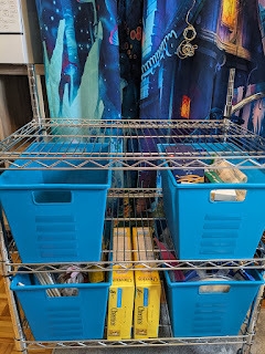 This photo might not look like much, but I've been needing to reconfigure this cart for a couple of months, but I was too injured to do it. My countertop dishwasher has been moved onto it, so that it's at a much more reasonable height for me as I continue to heal. This also let me slide an IKEA bookshelf over to make better use of my space. And having it on a cart is better in case I need to move it for some reason.