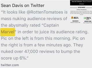 Nevertheless, the radical social reforms by the Trotskyite are being recognised at the grassroots level. There is massive pushback. Recently it was shown that @RottenTomatoes was 'mass nuking' audience reviews of the abysmally rated 'Captain Marvel' in order to juice its audience rating. It apparently nuked up 47,000 reviews over the weekend to bump the score by 6%.