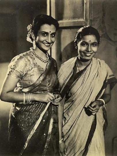 "Indian movie actresses. Dressed in sarees, 19-year old Binota Bose, left, and Mrs. Rekha Mullick, right, are right at home before the camera and lights. Miss Bose earns $360.00 per month and Mrs. Mullick $210.00. Both are well educated and prefer American books, pictures."