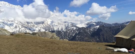 Fig. 10: The view as we peel open the leave of sheet from the inside of our tents in Triund. Do not need to go to the Alps for this view. The camping ground in Triund is a flat plateau overlooking some of the best breathtaking mountain range in the world. Snow-capped tips on one side with ravines and valleys as far as the eyes can see is a sight not for the faint-hearted.©FG