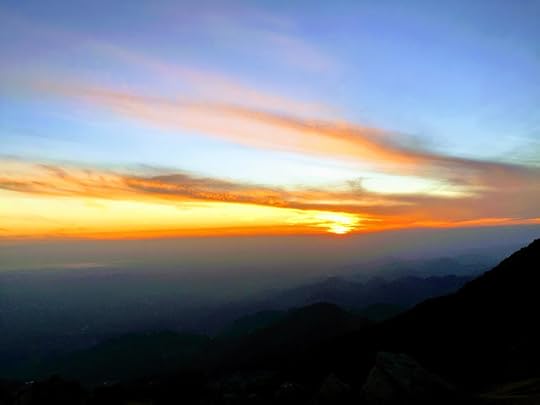 Fig. 11: The sun subtly announces the end of another day in paradise. Sunset in Triund. The horizon appears blue as if it were the ocean. In reality, it is just land and more land. The ground that stood still to the antics of Man over the millennia. ©FGThe picturesque view of the Indian sunset belied the trouble that was awaiting us as darkness fell. "It is our light, not our darkness that most frightens us," said Mandela. On the contrary, the temperature plummeted our anxiety of the cold raised. In the war between Man versus Nature, Mother Nature must have bowled him over many times. When looking up at the emptiness of the sky and counting stars became a seriously numbing business, we had to curl up to the comforts of the tent which housed the kitchen. With the warmth provided by the burning stove, the steamy soups, bread, accompaniments and the inhibitory input from the Devil's brew, we were in high spirits!