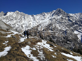 Many locals seem to treat this stretch of the hike as a literal 'walk-in-the-park'. College students with too much time on their hands were seen making last-minute decisions whether to make a day trip up to Triund. And some were still in their party clothes and stilettos from the night before, I reckoned. Surprisingly, they all eventually made it, in about 2 to 3 hours. I suppose they had the luxury of youth and home ground to their advantage.The landscape as we approached Triund is one of a surprise after another. Just as we thought we had the best postcard shot, right in front of our eyes would another and another. The best was yet to come. At the peak, flashed in our faces were 360o of panoramic flaunting of Mother Nature in her full glory - mountains, ridges, troughs, ravines, greenery, snow and rocks.