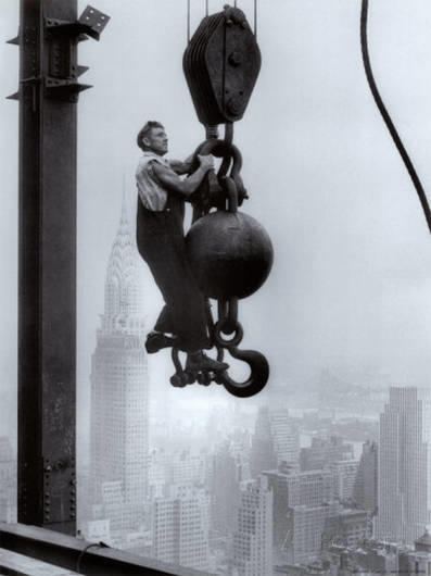 During the early 1900s, the building methods for the iconic New York skyline of today weren't the safest. In fact, many construction workers died in the process of constructing some of these high rise buildings. Here is a photograph of a construction worker for the Empire State building just hanging on a crane about New York City with no safety harness, very common for the time.
