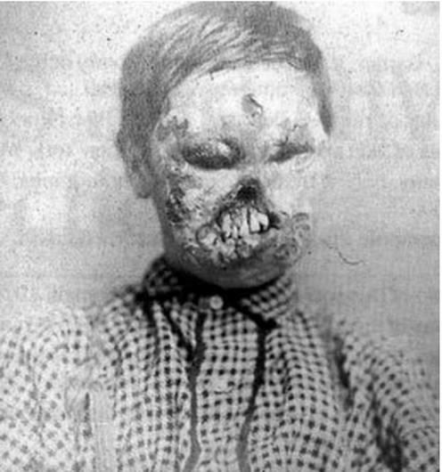 During the pre-penicillin era, syphilis was a major disease that devastated many. This is a photo of a young boy whose face suffered from the side effects of Congenital Syphilis. This condition occurred when a mother who was infected with Syphilis gave birth.