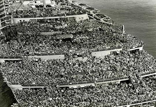 After V-Day, thousands of American soldiers came home in 1945. Here is a famous photograph of American troops arriving in New York City. They came home on the Queen Elizabeth and docked in the New York City harbour.