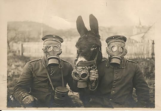 The technique of using gas as ware fare became a popular mode of destruction during WWI. To combat against this kind of weapon soldiers wore gas masks. Pictured here in 1916 are two German soldiers and their donkey all wearing gas masks.