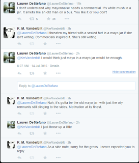 I ran into this issue today on Twitter. I follow Lauren DeStefano, author of The Chemical Garden series. I find a lot of her tweets hilarious; today's was no exception. Below is a screenshot of the conversation: