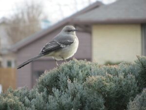 A beautiful mockingbird perched on our nearby evergreen. I expected him to whoosh away as soon as he caught sight of me or heard the cat-like squall of the screen door. But he stayed, holding still, allowing me to marvel in his beauty from just a few fe...