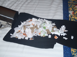 Tonight I went through all 14 posts and copied down every name from every comment and put all those names in the ice bucket in my hotel room. I used every single scrap of paper in the hotel room, including those coaster things they put under the glasses. For every comment you made, you received an entry into the grand prize drawing. From this photo, you can see there were hundreds and hundreds and hundreds of entries.