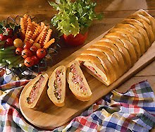On lightly floured surface, roll dough to 15 x 10-inch rectangle. Transfer to greased baking sheet. Sprinkle ham, cheese, pimientos, and pickles lengthwise over center-third of dough. With sharp knife, make cuts from filling to dough edges at 1-inch intervals along sides of filling. Alternating sides, fold strips at an angle across filling. Cover loaf; let rise in warm, draft-free place until almost doubled in size, about 20 to 40 minutes.