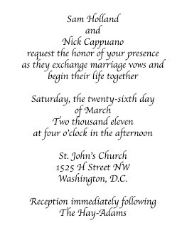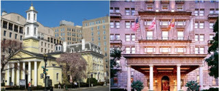 St. John's Episcopal Church, known as the Church of the Presidents due to its proximity across the street from the White House and Lafayette Square. The reception will be right next door at Washington's historic Hay-Adams hotel. I picture Sam & Nick, hand-in-hand, dashing across H Street with the White House in the background as they move from the church to the reception. The two locations are the ONLY decisions I've made or will make pertaining to the wedding. The rest is all up to you, the readers! I can't wait to see what you choose!