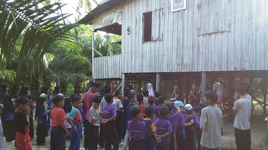 Bangunan sekolah pula tiada dinding, kipas mahupun lampu. Ya, open air. Kadang sambil mengajar dan perhimpunan kami ditemani kambing dan ayam.