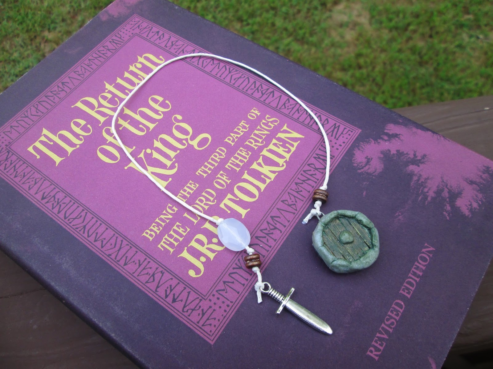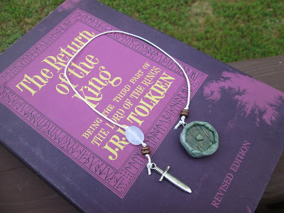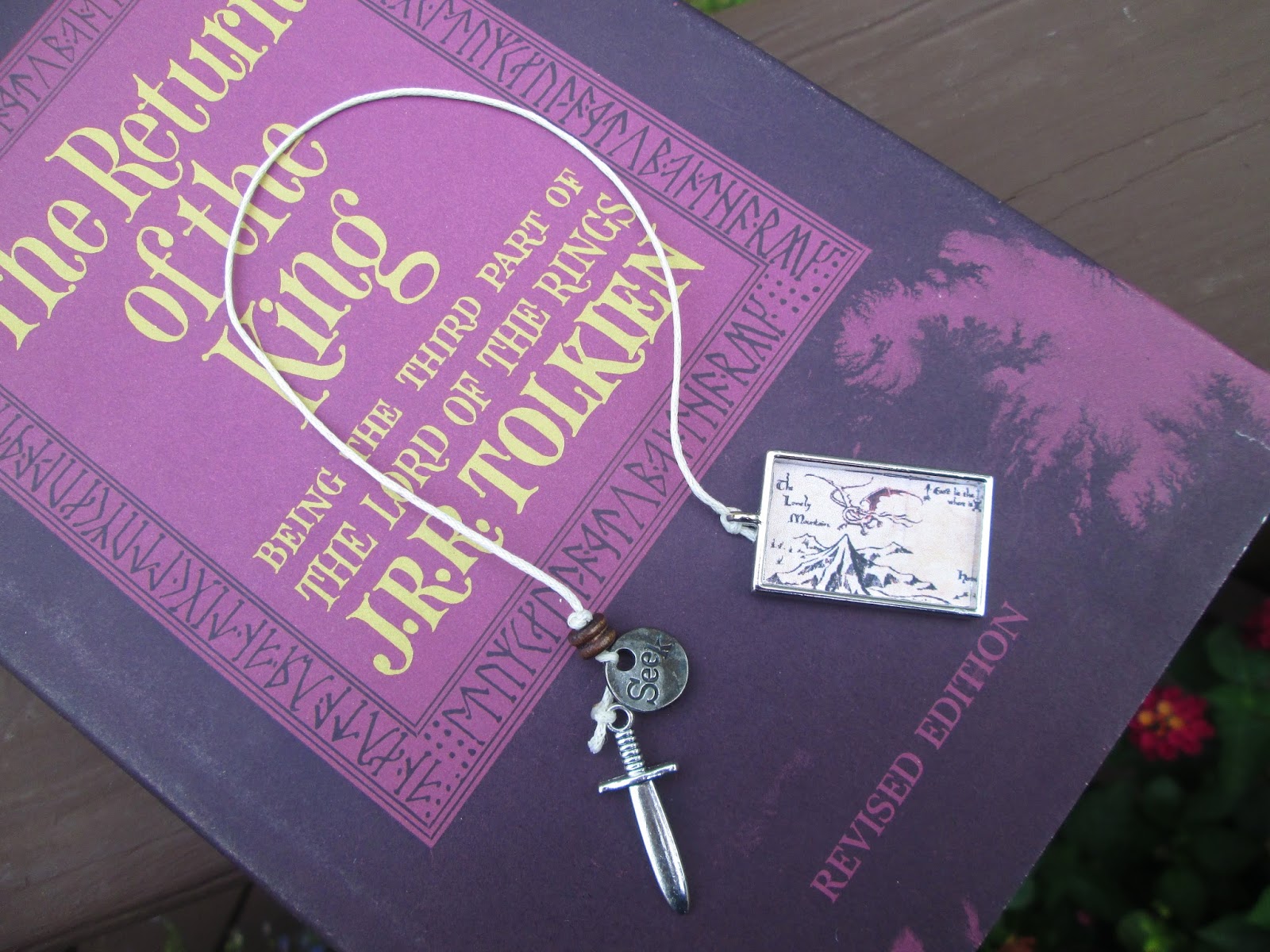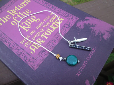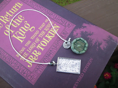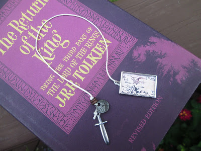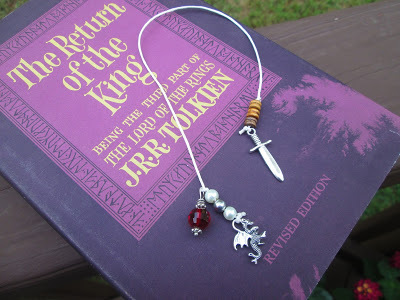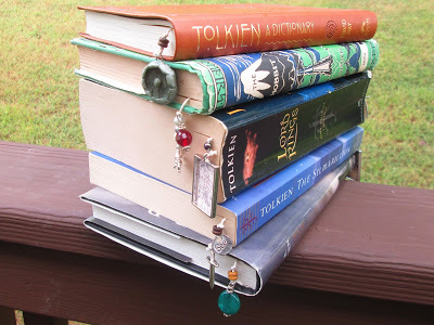 Just in case you've been eaten up with curiosity about what I'm giving away this year for the Tolkien Blog Party... now you can see that they are bookmarks! Which I made myself. They are thong bookmarks, so they have something on each end of a piece of cotton cord, and they should fit most hardcover books. If you're wondering what's on the other end of each of these... you'll find out on the 18th :-)