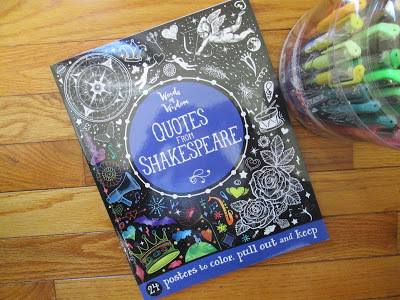 One of my blogging goals for 2019 is to start reviewing adult coloring books again. So today I'm reviewing the Words of Wisdom: Quotes from Shakespeare book of posters to color. These are big sheets -- 9 1/2" x 12" and can be framed -- I love the bigger format! I got this book from Usborne/Kane Miller here, and I'm not sure if it's available elsewhere or not.