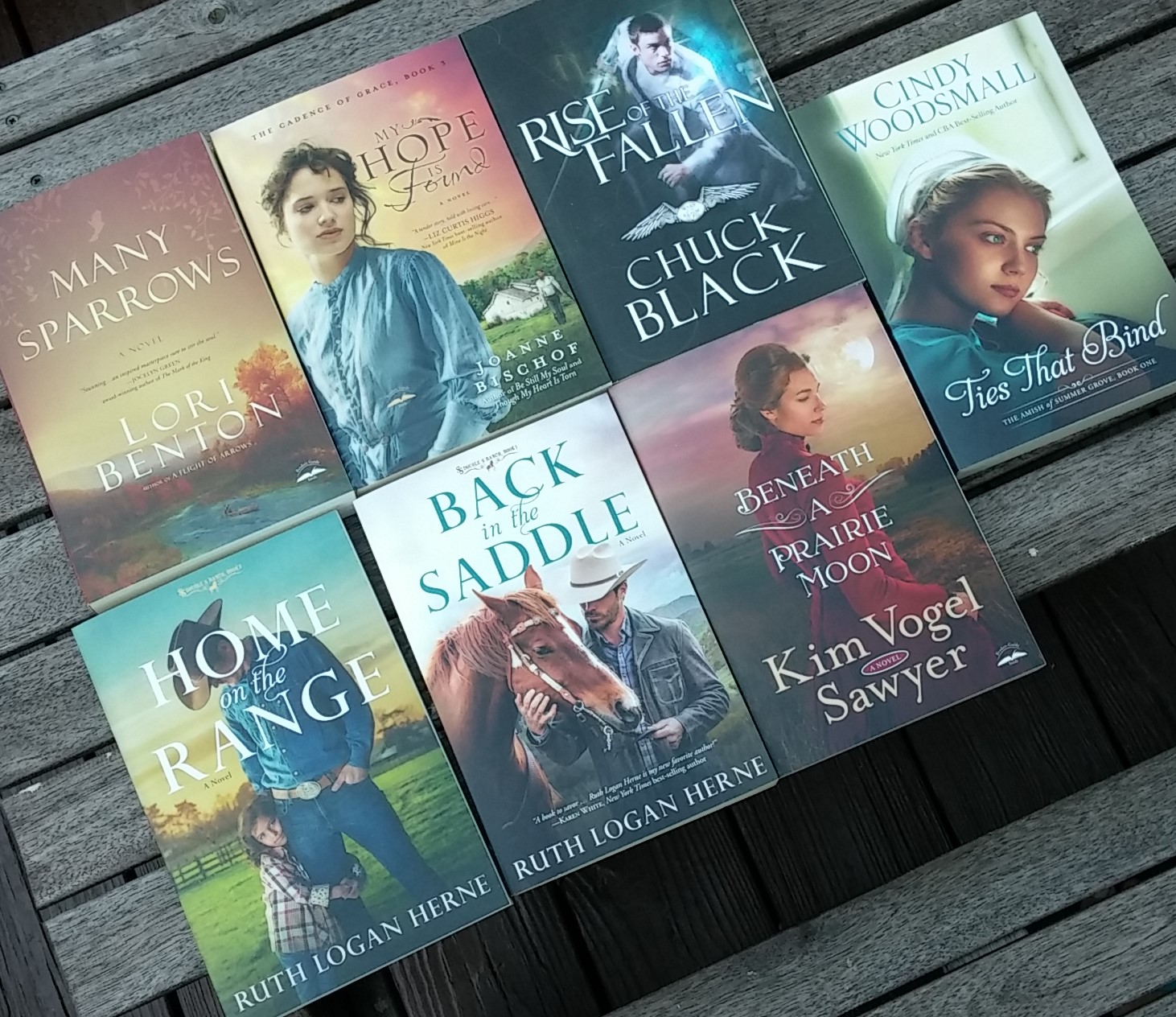 Back in June, I entered a giveaway hosted by Waterbrook & Multnomah Fiction on their Facebook page. A giveaway for seven of their Christian fiction titles. AND I WON!!! I got an email informing me that I won about a week ago, and my books came in the mail today. Looky: