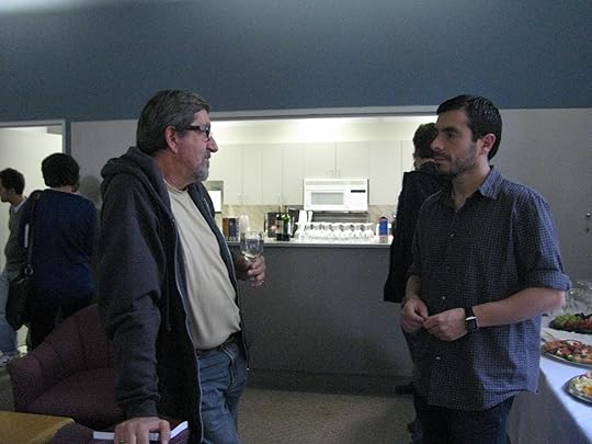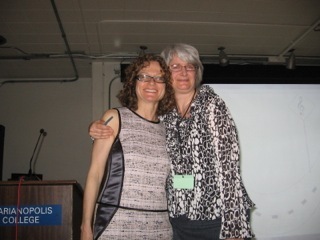 On Thursday, April 12th, I took part in Marianopolis College’s Arts Fest and gave a talk to an enthusiastic group of students on my newest book, Yellow Mini. It was the first time I was able to talk about the book and project the pages onto a large screen at the same time, which was really helpful in talking about things like form and meter. I was able to point out the way the characters in the book all have a distinct form for their poems: long lines and dense, almost prosaic stanzas for Mark, which suits his muddled mind; short lines and long, thin stanzas for the shyer Christopher. For some of the poems, I payed lots of attention to rhythm and meter, so I was able to show this on screen and talk about the importance of counting syllables. I think the students liked what I read, judging by the fact that they lined up to buy copies after. I felt bad, but I ran out. I guess I under-estimated myself yet again. Ha ha. Thanks to my good friend and fellow YA author, Monique Polak, for inviting me. Above is a photograph of the two of us together.