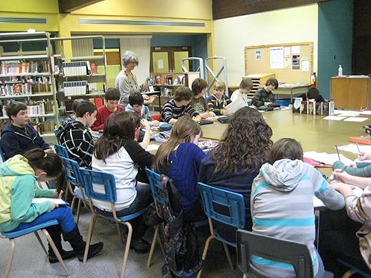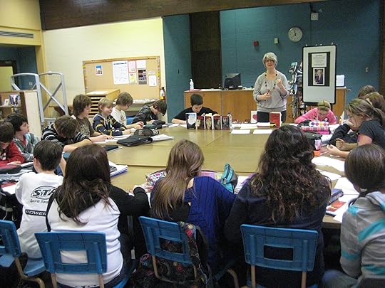 The grade seven class had actually already written poems from one of the book's five main characters' perspective, adding their own plot twists. I found it interesting that several had envisioned Mark hitting Mary with the car, injuring her badly, because when I started writing Yellow Mini I thought this might happen as well!