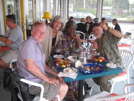 For two weeks in June, my writer friend Jane Barclay (Btw: recent winner of the Ruth Schwartz Children's Book Award) and I rented a lovely cottage in Hunt's Point, Nova Scotia, for the primary purpose of doing some serious work on our young adult novels. It was a road trip with a literary mission: to seclude ourselves from family, friends, and even technology and produce some good writing. In the last picture above you can see us waiting for the ferry in St. John, New Brunswick, on a...