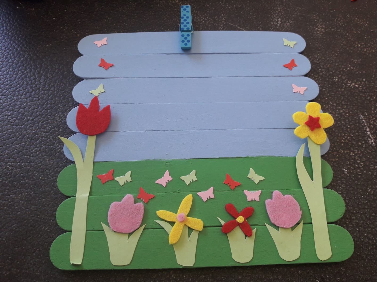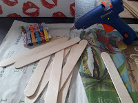 Lo primero los materiales: palos de helado (se pueden adquirir en bazares), pinzas pequeñas decoradas (también en bazares), cola, pinturas, pinceles, cartulinas... Y todo lo que quieras para decorar.