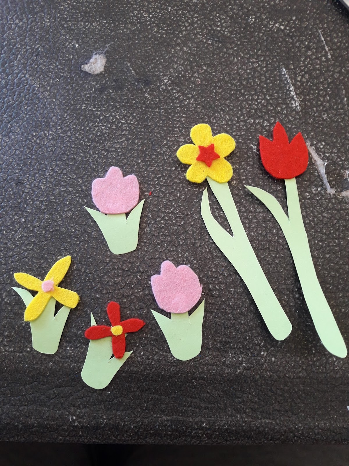 Con cartulina y fieltro recorté estas flores para pegarlas en el jardín.