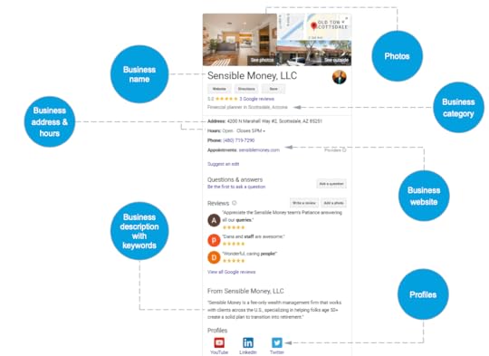 3. Optimize Your “Off-Page” ContentOff-page content is what you can do outside of your website to improve your SEO and increase visibility in search results. The most impactful strategy financial advisors can take is to optimize their Google Business Profile. This is because Google provides preferential SEO treatment to firms that have registered with Google My Business, even if the actual content of your profile is lacking in terms of SEO. Those who register with GMD and optimize their content will be much more likely to land on the first page of search results.