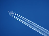 Contrail – A streak of condensed water vapor in the air due to the heat produced by aircraft engines at high altitudes.