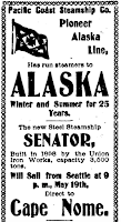 Three days prior to when they article ran, the SS Excelsior arrived in San Francisco with over $500,000 worth of gold. These two reports prompted an immediate stampede to Nome, Alaska by thousands of men and women to seek their fortune. The percentage of those who “struck it rich” was small, with merchants, suppliers, and service providers often earning more than the miners. Before they could dig for gold, the miners had to find a way to the gold fields. The land route was long and treacherous. Travelers on this course had the choice of carrying several hundred tons of foods and necessities with them or purchasing the items at exorbitant rates upon their arrival. Most prospectors elected to make the trip via steamship, either from San Francisco or Seattle.