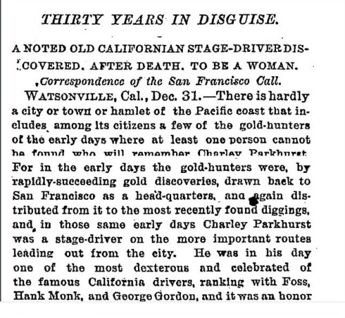 He was in his day one of the most dexterous and celebrated of the famous California drivers ranking with Foss, Hank Monk, and George Gordon, and it was an honor to be striven for to occupy the spare end of the driver’s seat when the fearless Charley Parkhurst held the reins of a four- or six-in hand...Last Sunday in a little cabin on the Moss Ranch, about six miles from Watsonville, Charley Parkhurst, the famous coachman, the fearless fighter, the industrious farm and expert woodman died of cancer on his tongue. He knew that death was approaching, but he did not relax the reticence of his later years other than to express a few wishes as to certain things to be done at his death. Then, when the hands of kind friends who had ministered to his dying wants came to lay out the dead boy of the adventurous Argonaut, a discovery was made that was literally astounding. Charley Parkhurst was a woman.” As they say, truth is usually stranger than fiction.