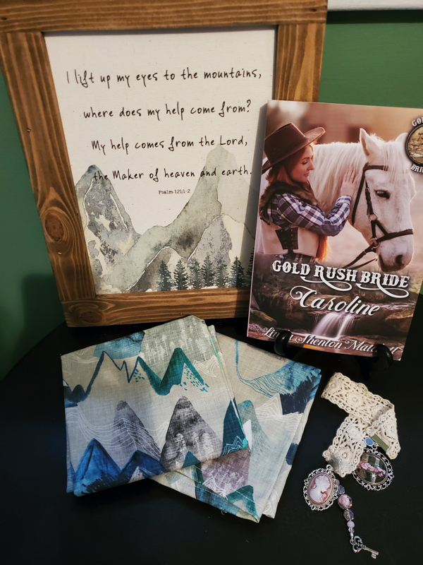 In celebration of the launch, I'm doing a fun giveaway you can enter and share with your friends. You are going to love the prizes because each one is handmade by an artist on Etsy. In addition to an autographed copy of Gold Rush Bride Caroline, the winner will receive a framed canvas by TheWoodedLane featuring Psalm 121:1-2 I lift up my eyes to the mountains, a pair of handmade "mountain" tea towels by Kettenglied, a handcrafted lace bookmark from JAustenBoutiqueCo. If an international winner is chosen, he or she will win an ebook edition of Gold Rush Bride Caroline and a $50 Visa Gift Card.
