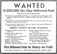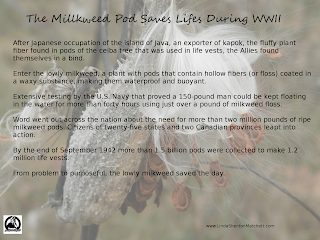 “Necessity is the mother of invention” proved itself to be true over and over during World War II as the Allies fought to defeat the Axis powers. Each time the enemy conquered an area that provided goods, an alternate solution had to be found. After Japanese occupation of the island of Java, an exporter of kapok, the fluffy plant fiber found in pods of the ceiba tree that was used in life vests, the Allies found themselves in a bind. Cattail down, feathers, and “Bubblfil,” a plastic substance developed by DuPont, were considered by the military, but none of the options proved worthy. Enter the lowly milkweed, a plant with pods that contain hollow fibers (or floss) coated in a waxy substance, making them waterproof and buoyant. Considered an annoying weed by most people, especially farmers, milkweed goes to seed creating the pods in September.