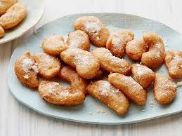 Drop in the fritters and fry until puffed and nicely browned. Then drain them on absorbent paper. Serve hot at once with powdered sugar and a bit of some red jelly on each fritter.