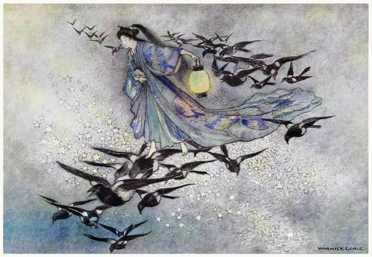 Orihime, tejedora, vive portándose bien en el cielo, cumpliendo con sus obligaciones a orillas del río Amanogawa (que aquí abajo conocemos como la Vía Láctea). Su padre, el Rey Celestial, está muy orgulloso del trabajo de su hija. Las versiones difieren en la forma en que la abnegada Orihime conoce a Hikoboshi, un pastor de bueyes que vive al otro lado del río, pero el caso es que se enamoran y se casan.