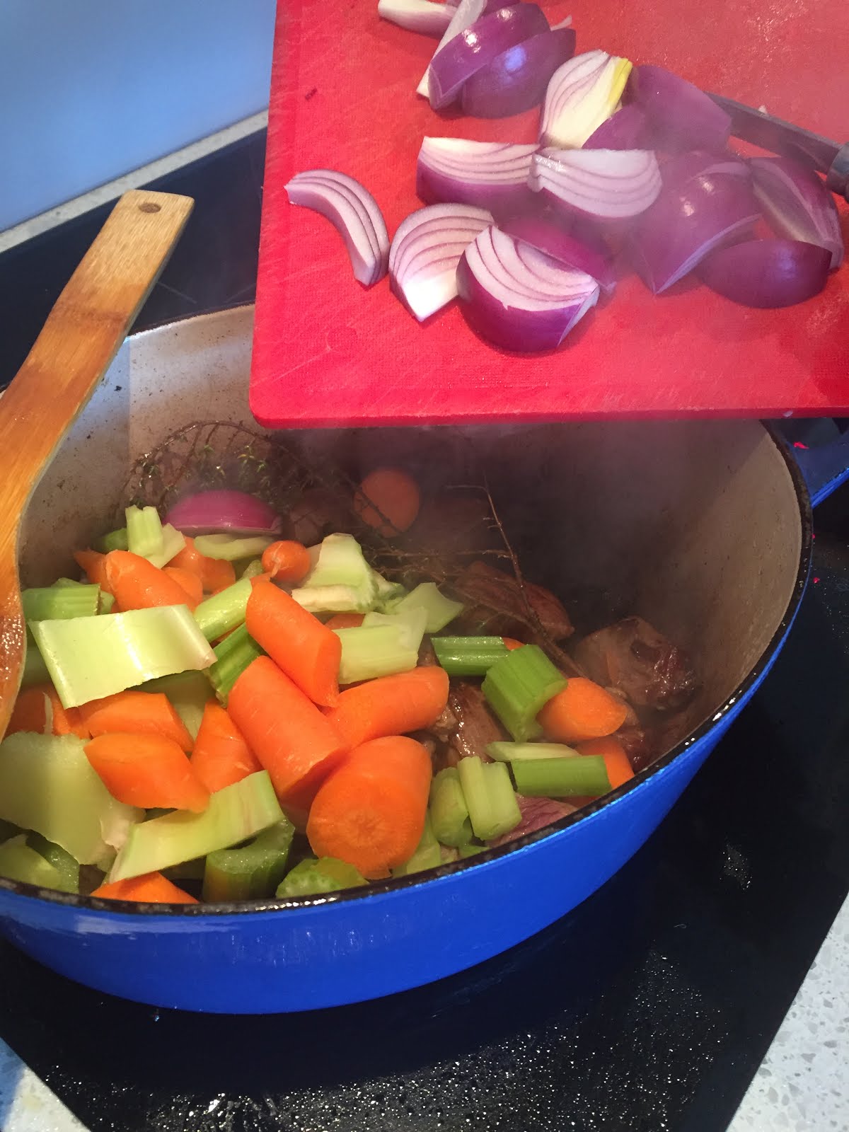 Here I go again. Talking about food when I have no right to do so. But, in honour of the Tour de France - a race that I have come to know and love over the last ten years - we made a French meal. Actually, we never need an excuse for this, and I use the term 'we' loosely. I watched, took photos and sampled the red wine as the beef stew (boeuf bourguignon) was being put together.