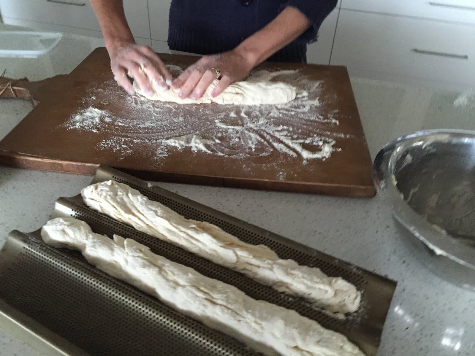 When we moved back from living in France to Australia, there were many things that we missed. So many, in fact, that it was a difficult period for us all. But, let's not dwell on that today. Instead, close your eyes and breathe in, listen to the crunch and taste the, nearly authentic, French bread that made us feel a little closer to our French home. Of course, you'll need to turn on the oven to as high as your oven will go, and chances are you'll look more longingly at the long, cylindrical shapes you create if you have on hand the nifty baguette trays (as ordered on line by yours truly). Don't forget to divide the dough into 3, score each loaf, set your timer for 18 minutes or so and then ahh..Miam! Miam!